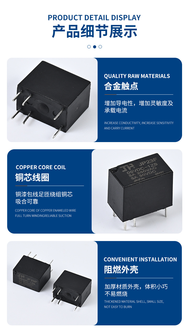 它主要由铁芯线圈,电枢(动铁芯),绷簧,动触头,静触头和一些端子组成。静触头包括常闭触头和常开触头。在正常情况下,动触头闭合到常闭触头。继电器基座组合只需在线的两头施加相对的电压,相对的电流就会流过线圈,然后产生电磁效应。电枢将在电磁力吸力弓的效果下吸收绷簧抵靠绷簧芯的回复力,然后驱动运动。触点
