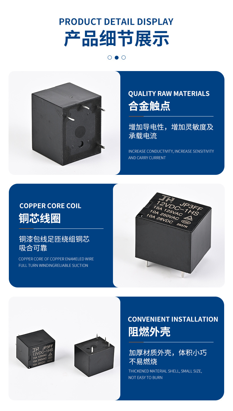 它主要由铁芯线圈,电枢(动铁芯),绷簧,动触头,静触头和一些端子组成。静触头包括常闭触头和常开触头。在正常情况下,动触头闭合到常闭触头。继电器基座组合只需在线的两头施加相对的电压,相对的电流就会流过线圈,然后产生电磁效应。电枢将在电磁力吸力弓的效果下吸收绷簧抵靠绷簧芯的回复力,然后驱动运动。触点