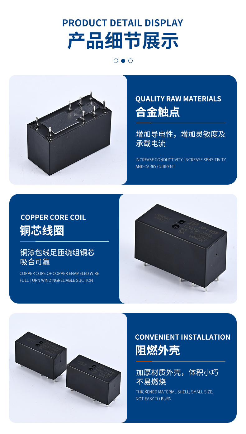 它主要由铁芯线圈,电枢(动铁芯),绷簧,动触头,静触头和一些端子组成。静触头包括常闭触头和常开触头。在正常情况下,动触头闭合到常闭触头。继电器基座组合只需在线的两头施加相对的电压,相对的电流就会流过线圈,然后产生电磁效应。电枢将在电磁力吸力弓的效果下吸收绷簧抵靠绷簧芯的回复力,然后驱动运动。触点