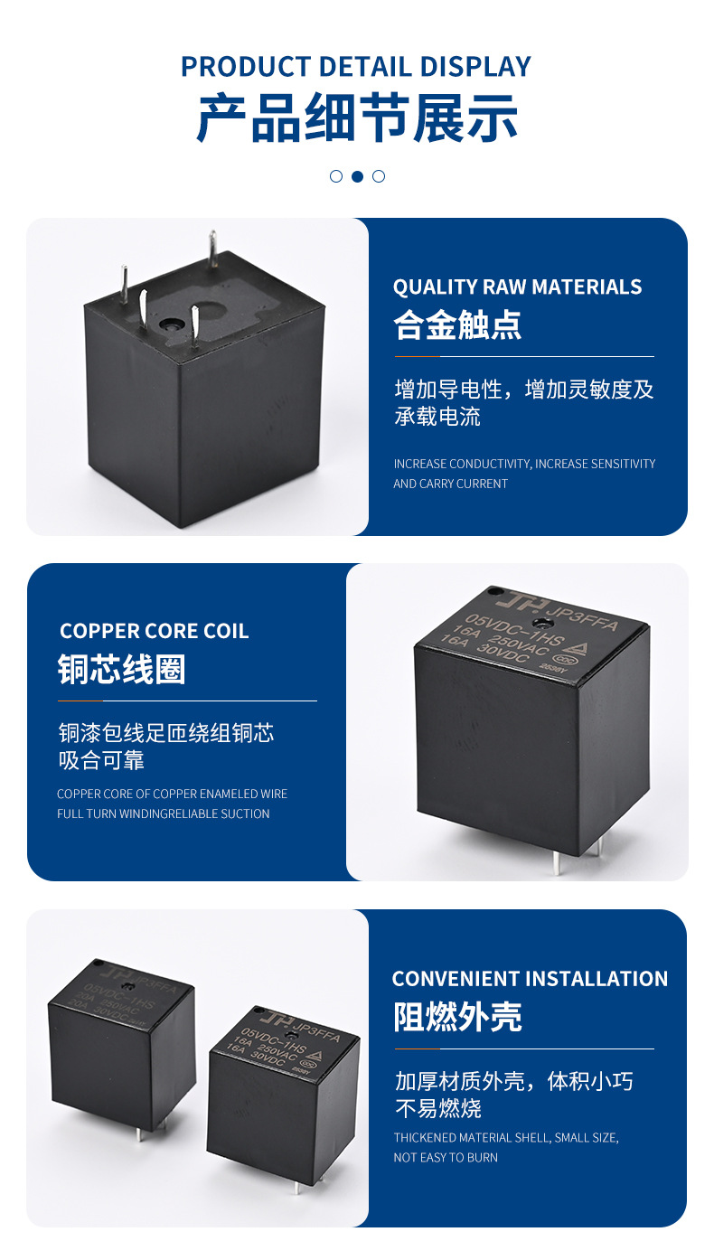 它主要由铁芯线圈,电枢(动铁芯),绷簧,动触头,静触头和一些端子组成。静触头包括常闭触头和常开触头。在正常情况下,动触头闭合到常闭触头。继电器基座组合只需在线的两头施加相对的电压,相对的电流就会流过线圈,然后产生电磁效应。电枢将在电磁力吸力弓的效果下吸收绷簧抵靠绷簧芯的回复力,然后驱动运动。触点